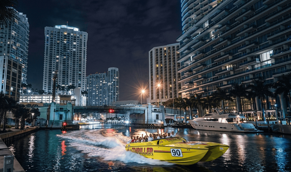 The Miami River Tour is a leisurely, idle-speed sightseeing cruise focused on history, architecture, and scenic night views of the Miami skyline. The Thriller Speedboat Tour is a high-speed adrenaline experience reaching speeds of up to 40 miles per hour. The River Tour is ideal for families, couples, seniors, and guests who want a relaxed, informative experience with no physical restrictions. If you are looking for speed and excitement, the Thriller Speedboat Tour is the better choice. If you want to truly see and understand Miami from the water, the River Tour delivers that experience.
